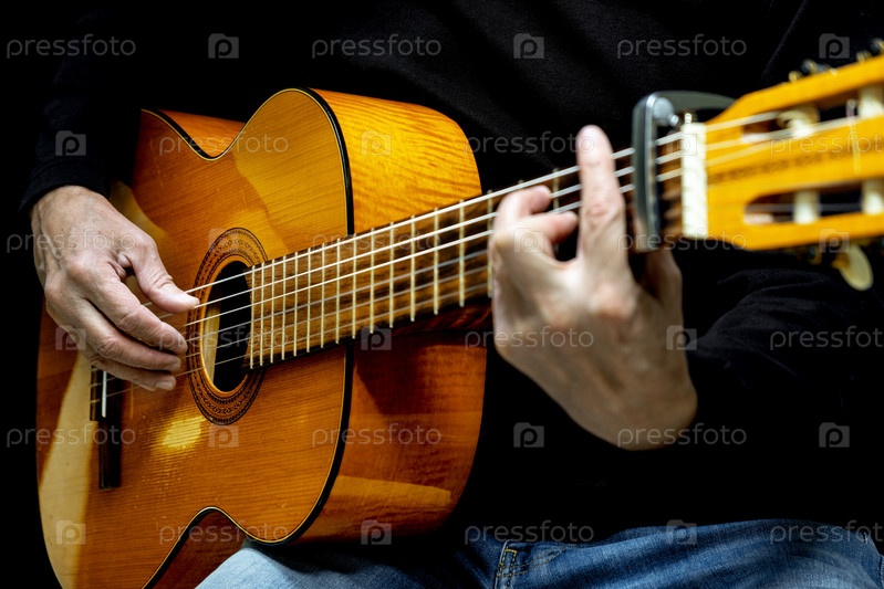 Гитарист играет на акустической гитаре на черном фоне, избирательный фокус