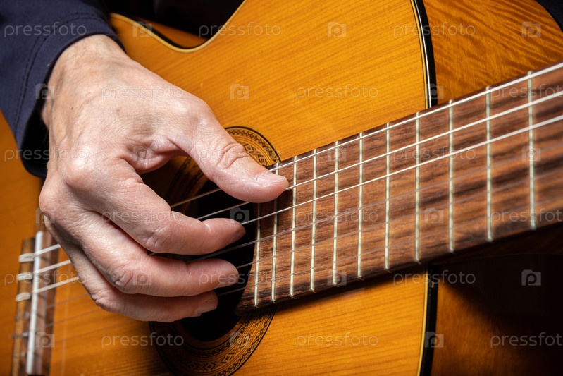 Гитарист играет на акустической гитаре на черном фоне, выборочный фокус. Мужчина-музыкант играет на гитаре. обложка для онлайн-курсов. Мужчина играет на акустической гитаре. пространство для копирования музыкальной концепции