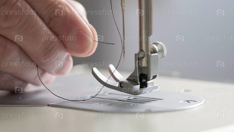 Подготовка к шитью. Швея вставляет нить в иглу швейной машины, вид сбоку. Портной работает в мастерской. Швейная мастерская. Концепция фабрики, дома, на работе, профессионалов