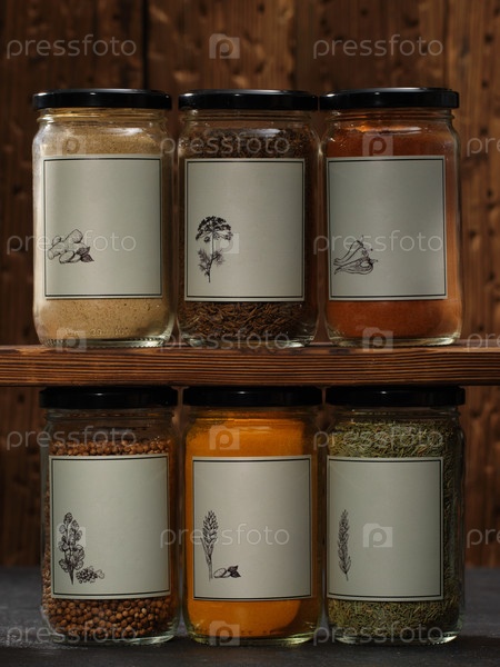 Сушеные специи в стеклянных банках на полках. Ассорти молотых специй