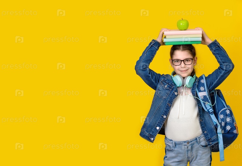 Маленькая девочка держит голубой пустой плакат и улыбается. девушка держит синий пустый пустой плакат для вашего текста или изображения на желтом фоне. Девушка держит синюю рекламную доску, Copyspace