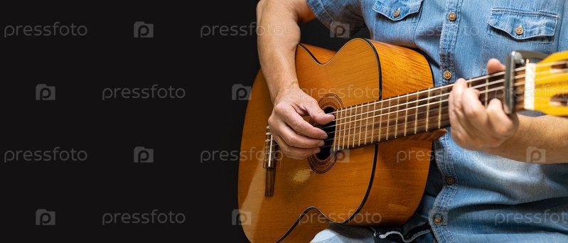 Гитарист играет на акустической гитаре на черном фоне, избирательный фокус