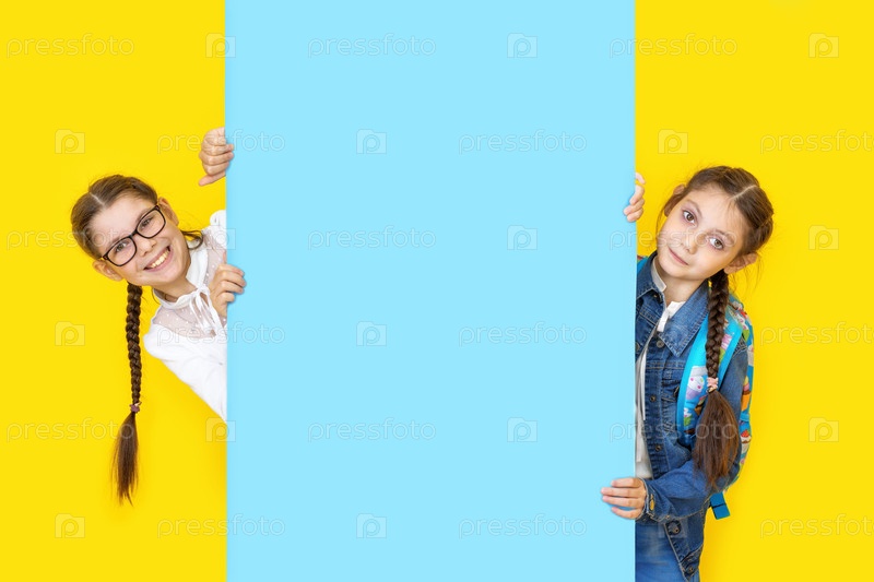 Маленькая девочка держит голубой пустой плакат и улыбается. девушка держит синий пустый пустой плакат для вашего текста или изображения на желтом фоне. Девушка держит синюю рекламную доску, Copyspace