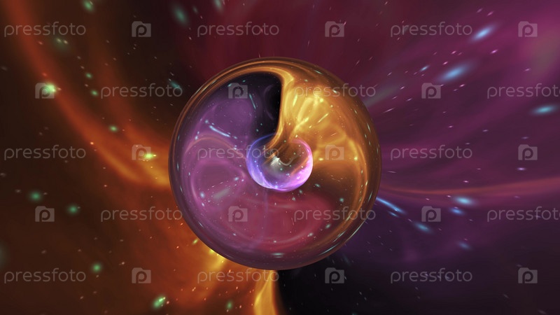 Иллюстрация галактики шар абстрактный фон. Желтый и фиолетовый галактический шар на цветном фоне