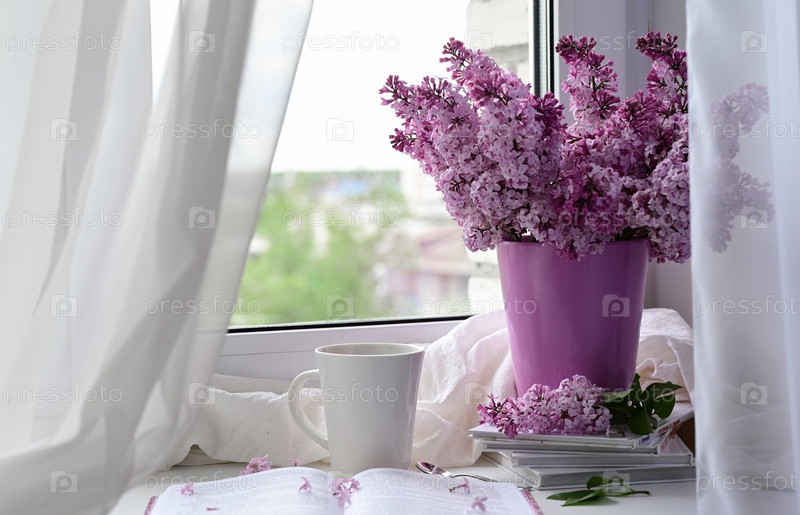 Открытка красивая. Кружка чая, старая книга и букет фиолетовой сирени. Красивый натюрморт. Весеннее время. Концепция доброго утра