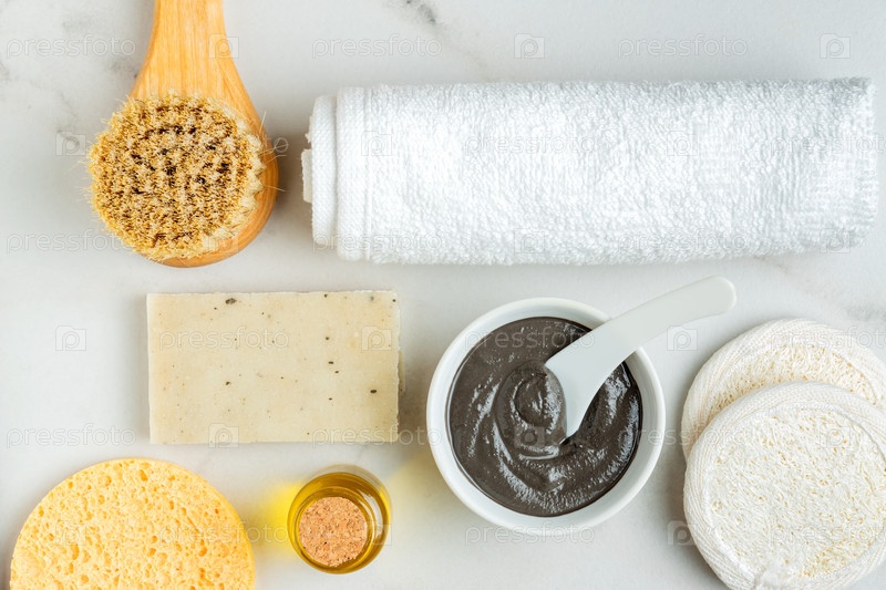 Косметическая глина. глиняная маска для лица на светлом фоне. спа аксессуары. натуральная косметика для косметических процедур. Концепция красоты. вид сверху