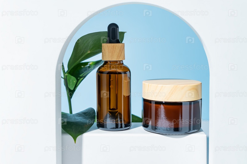 Модная композиция с флаконом-капельницей с маслом для лица или сывороткой и баночкой с кремом в декоративной арке, натуральный уход за кожей, крем для лица и лосьон для тела. Натуральная органическая косметическая спа-концепция