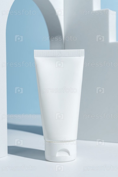 Концепция продукта красоты. Белый тюбик крема на синем фоне. Передний план. Модная витрина с жестким светом. Небрендовая упаковка
