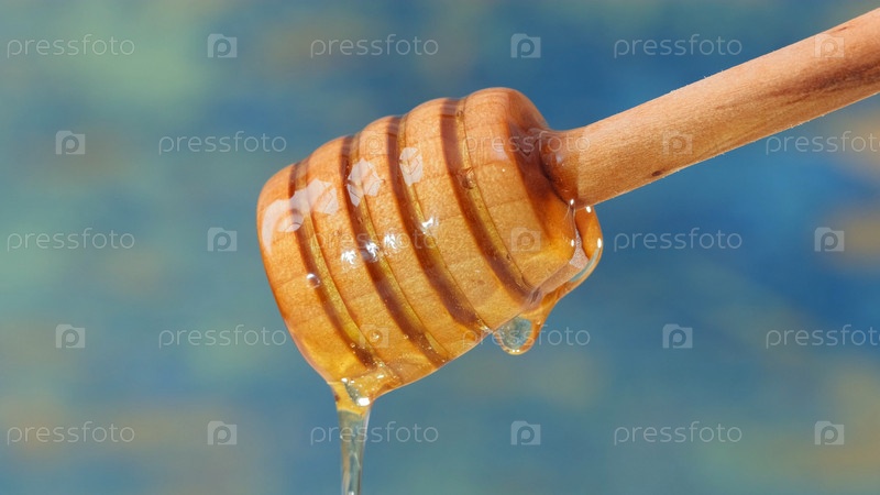 Свежий мед льется и течет из деревянной ложки ковша на синем фоне