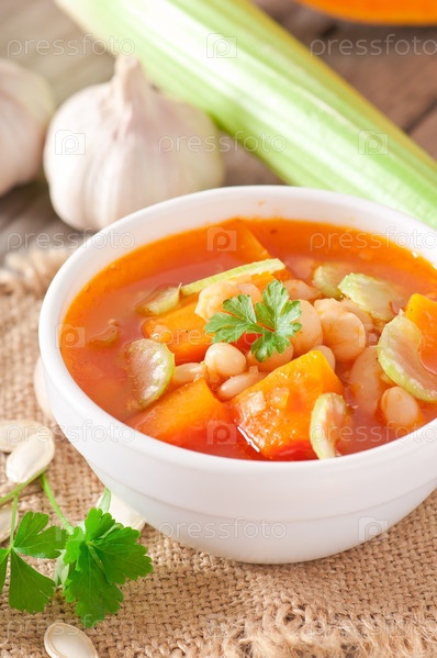 Томатный суп с тыквой, бобы и сельдерей