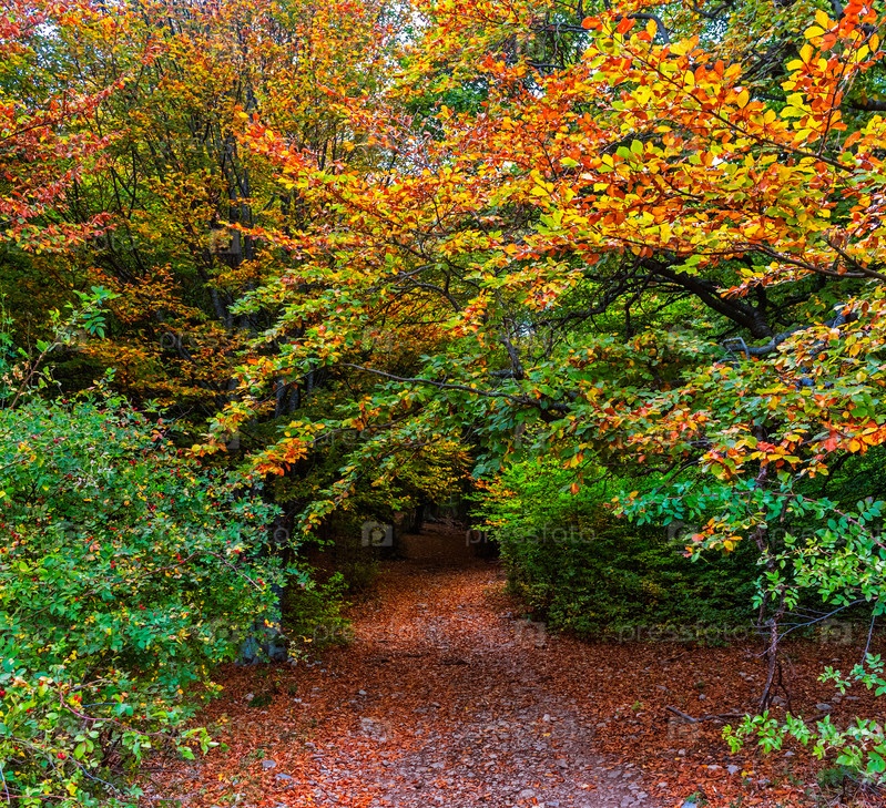 Тропинка в осенней буковой роще с зелеными и желтыми листьями на деревьях