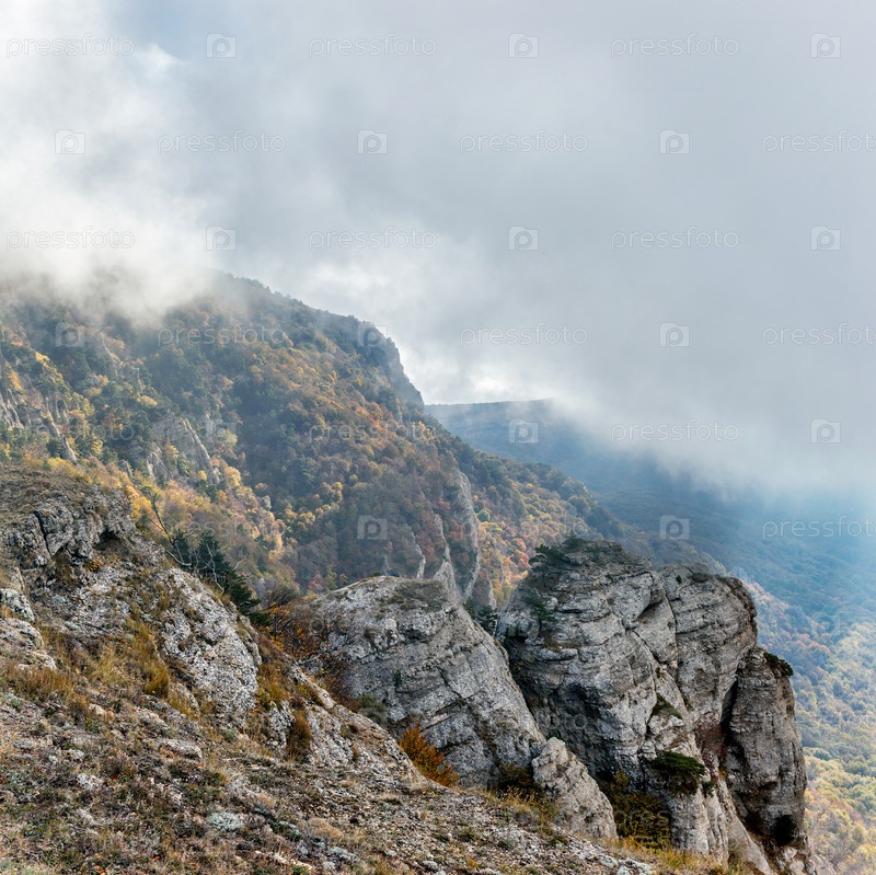 Туманные скалы в крыму в пасмурный осенний день