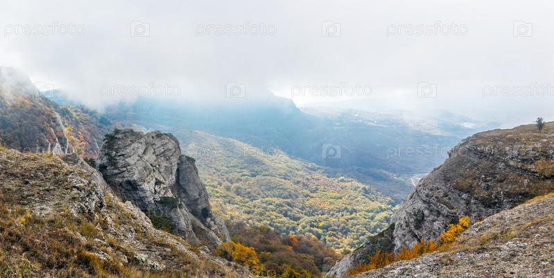 Туманные скалы в крыму в пасмурный осенний день
