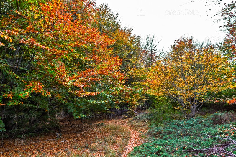 Тропинка в осенней буковой роще с зелеными и желтыми листьями на деревьях