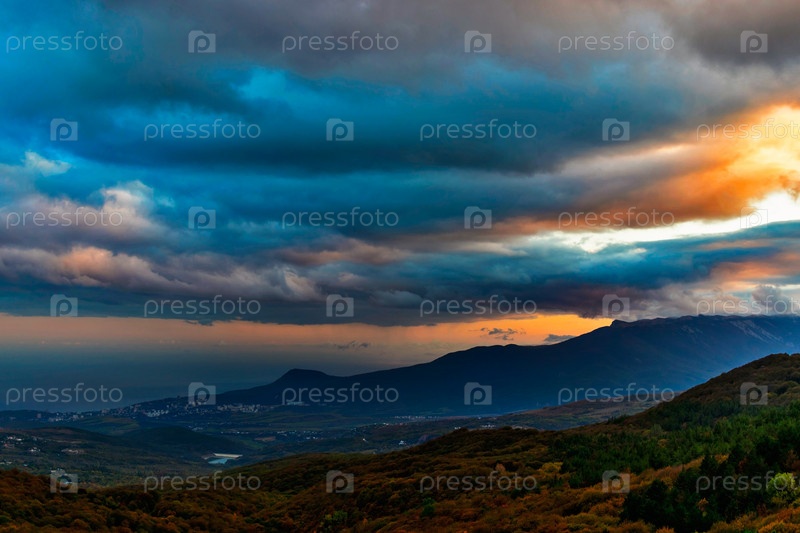 Закат над холмами и морем в крыму осенним вечером