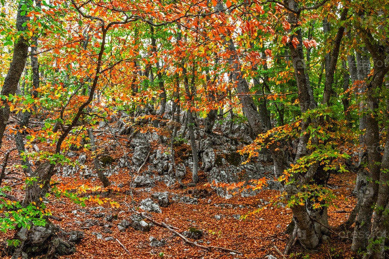 Скалы в осенней буковой роще с зелеными и желтыми листьями на деревьях