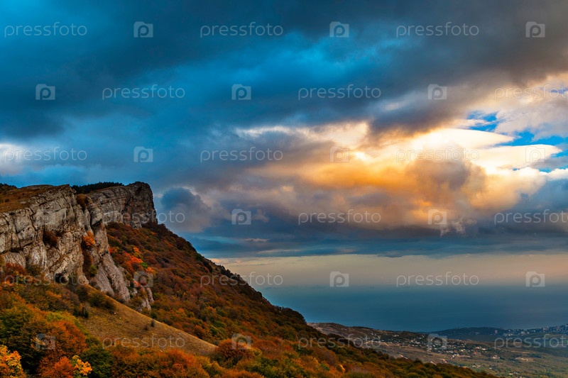 Закат над холмами и морем в крыму осенним вечером