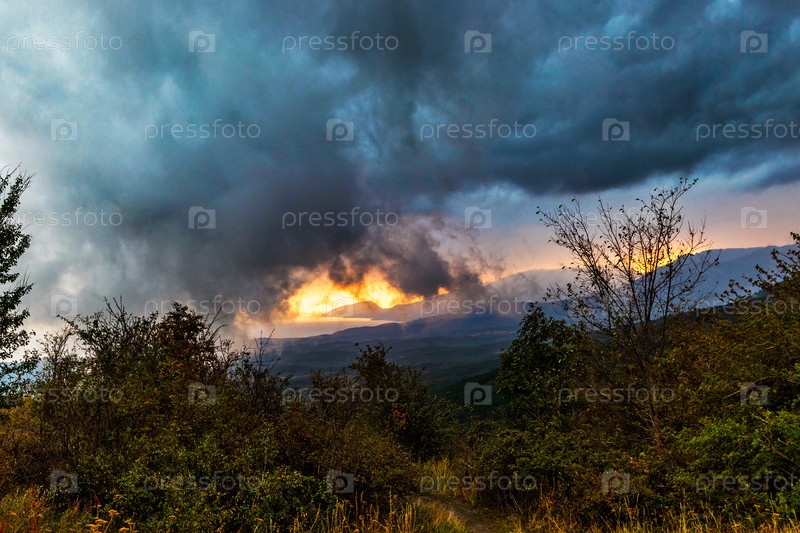 Закат над холмами и морем в крыму осенним вечером