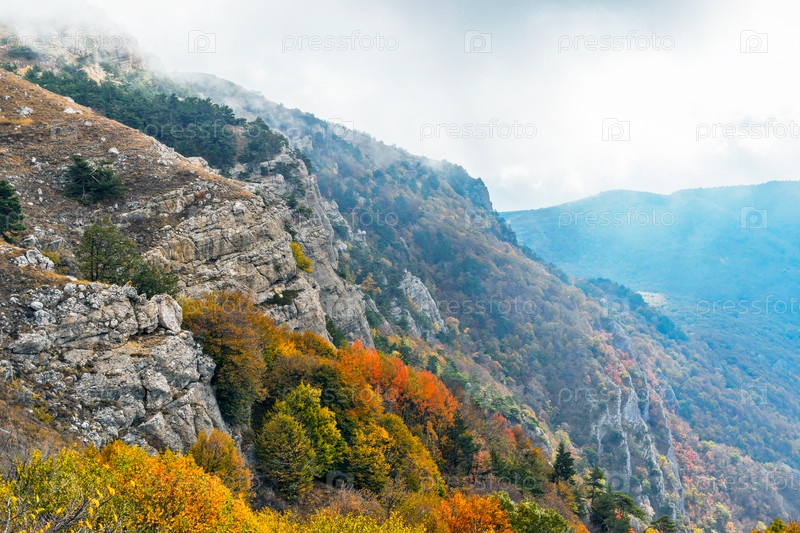 Туманные скалы в крыму в пасмурный осенний день