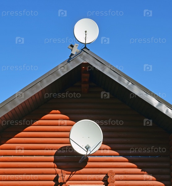 Две спутниковые антенны на стене и крыше деревянного дома