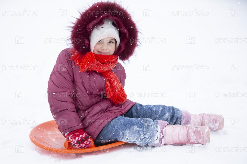 Ребенок зимой. Девушка катается на санках