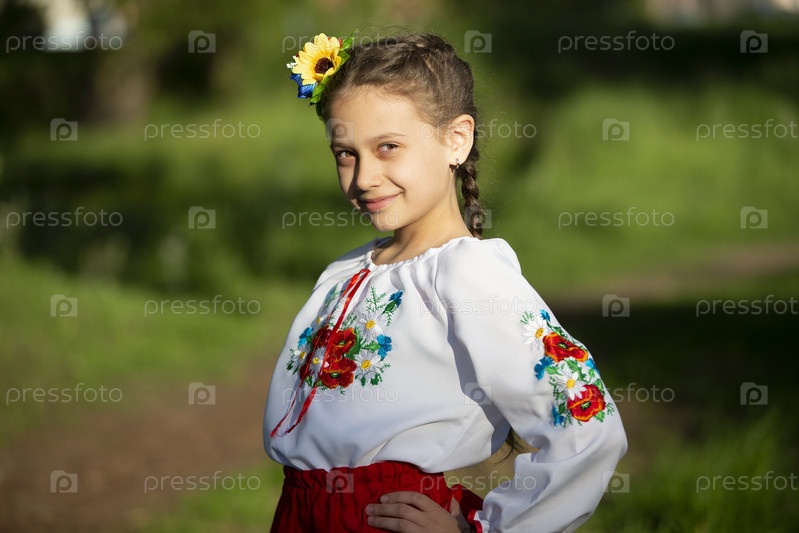 Маленькая украинка и белоруска в вышиванке на летнем фоне