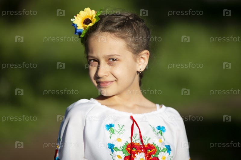 Маленькая украинка и белоруска в вышиванке на летнем фоне