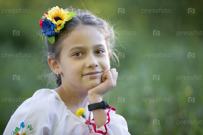 Маленькая украинка или белоруска в вышиванке на летнем фоне