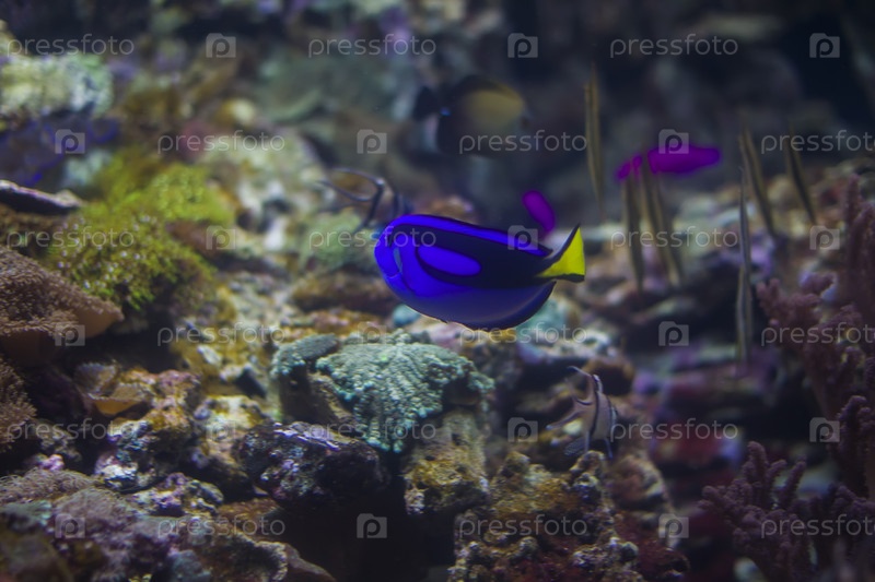 Синяя яркая рыба-хирург на фоне разноцветных кораллов