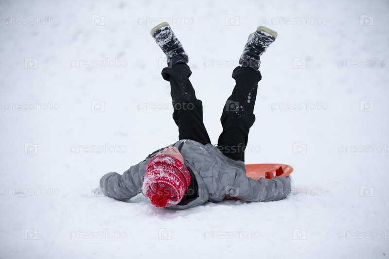 Ребенок зимой. Мальчик катается на санках