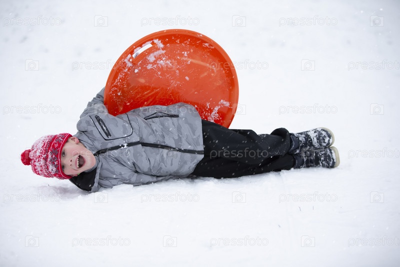 Милый мальчик улыбается, катаясь на санках