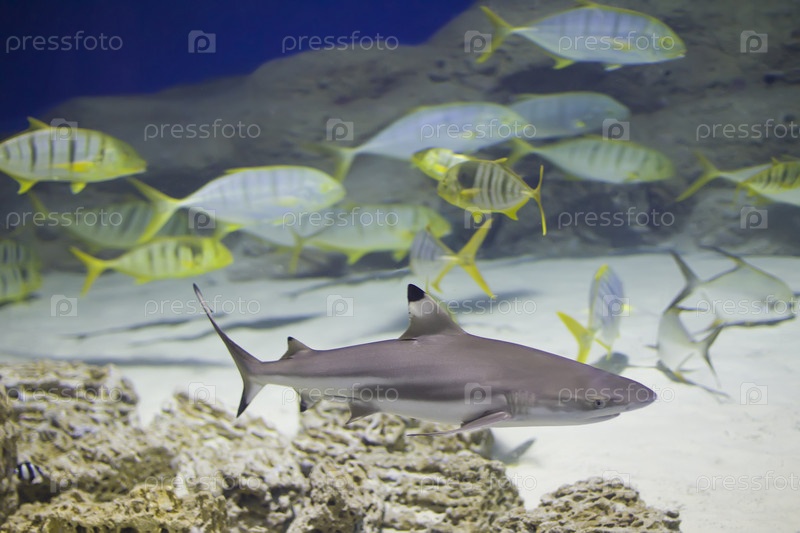 Глубоководная акула на фоне стаи тропических рыб