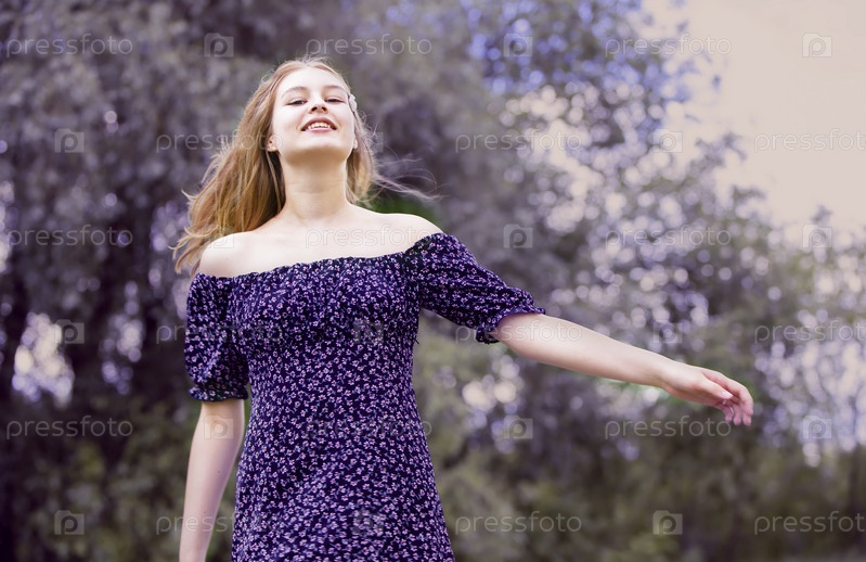 Счастливая молодая девушка в романтическом платье на зеленом летнем лугу. Красивая девушка-подросток улыбается и смотрит в камеру