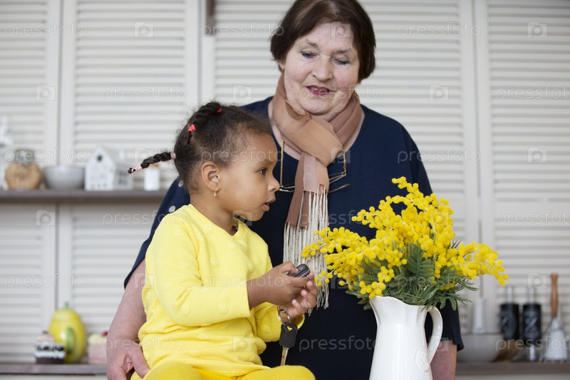 Бабушка и внучка из разных рас. бабушка играет с темнокожей внучкой
