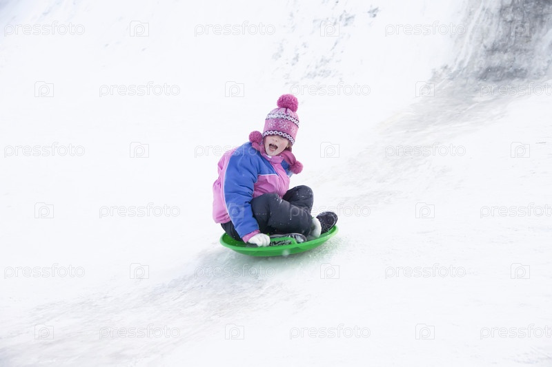 Девушка в зимней куртке с криком съезжает со снежной горки
