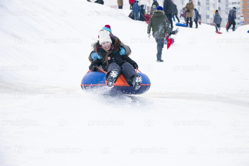 Беларусь, город Гомель, 07 января 2018 года. Центральный парк. Чизкейк для катания на санках. Катание на санках со снежной горки. Дети спят на санках