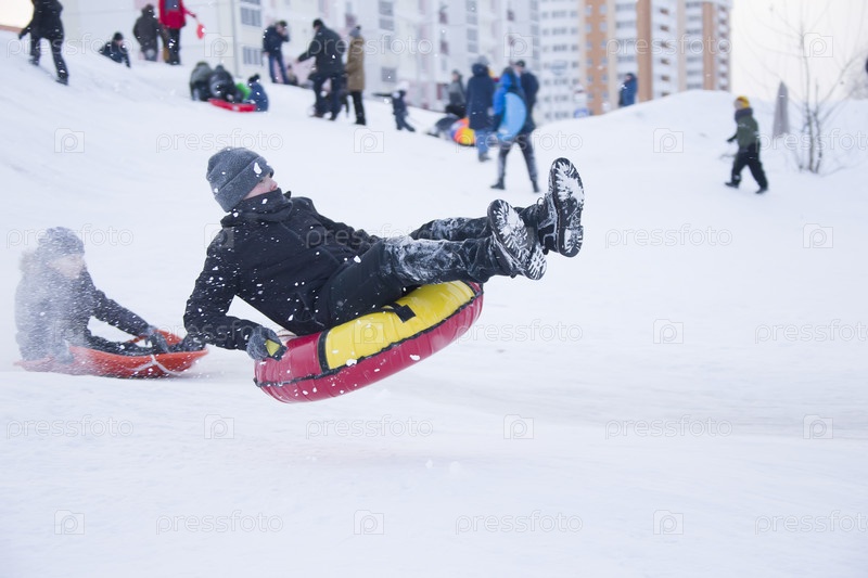 Беларусь, город Гомель, 07 января 2018 года. Центральный парк. Катание на санках со снежной горки. Мальчик на санках прыгает с трамплина. Опасный катание на санях