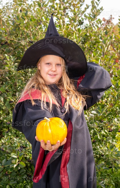 Хэллоуин. Девочка в мантии и шляпе. Маленькая волшебница в костюме
