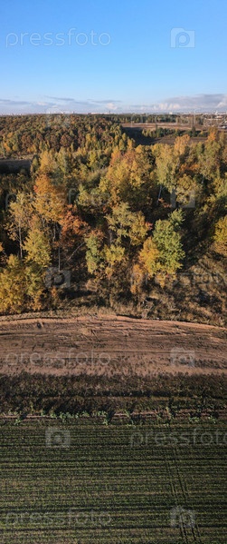 Сельскохозяйственные культуры. Поле с зелеными ростками. Зимняя культура. По краям поля лес с пожелтевшими осенними листьями. Аэрофотосъемка