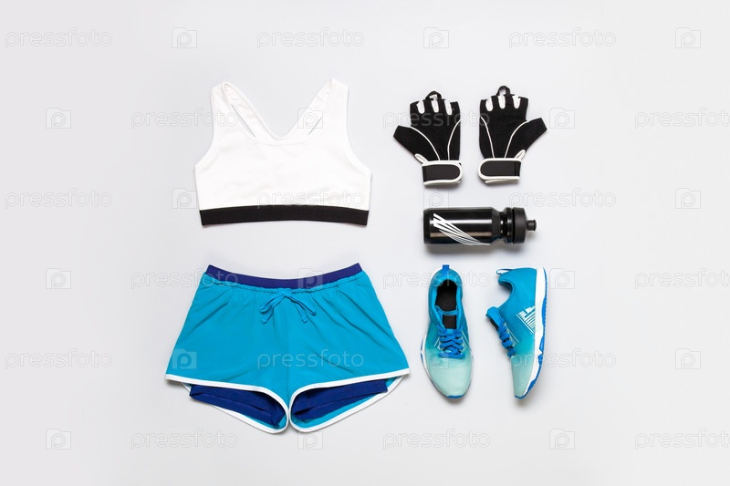 Спортивная модная одежда плоский натюрморт изолированный снимок сверху на сером фоне. Композиция из спортивной одежды для тренировок на сером фоне