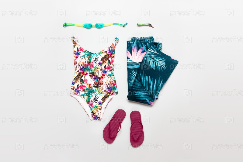 Модный спортивный костюм для плавания, плоский натюрморт, изолированный снимок сверху на сером фоне. Композиция из спортивной одежды для плавания на сером фоне