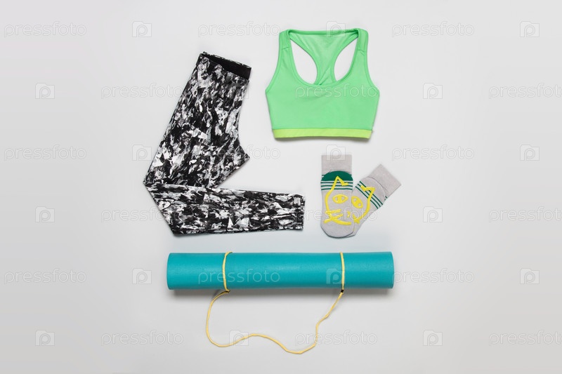 Модный спортивный костюм для йоги, плоский натюрморт, изолированный снимок сверху на сером фоне. Композиция из спортивной одежды для йоги на сером фоне