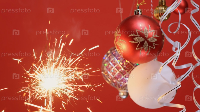 Новогодние разноцветные шары и бенгальский огонь Яркое горение