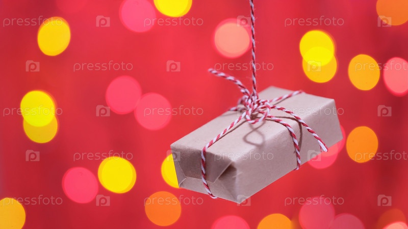 Декоративная подарочная коробка, перевязанная красной лентой, вращается на веревке