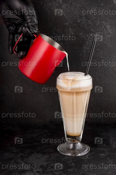 Крупный план бариста, готовящего кофе с сиропом и кремовой пеной в магазине или кафе на десерт из суфле