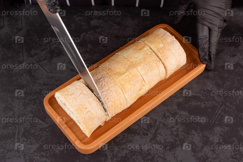 Десертный рулет безе со свежей грушей на темном фоне в кафе