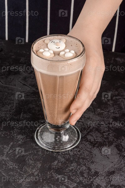 Какао-напиток, украшенный забавным печеньем на темном фоне