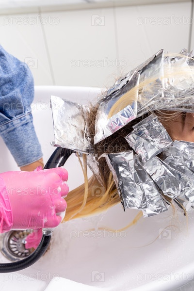 Парикмахер красит женские волосы, делая блики своему клиенту с помощью фольги. Женщине моют волосы в парикмахерской