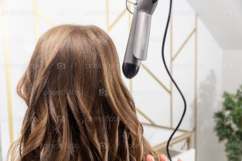 Парикмахер готовит женщину, которая делает прическу с кудрями с помощью щипцов для завивки. Длинные темно-русые натуральные волосы