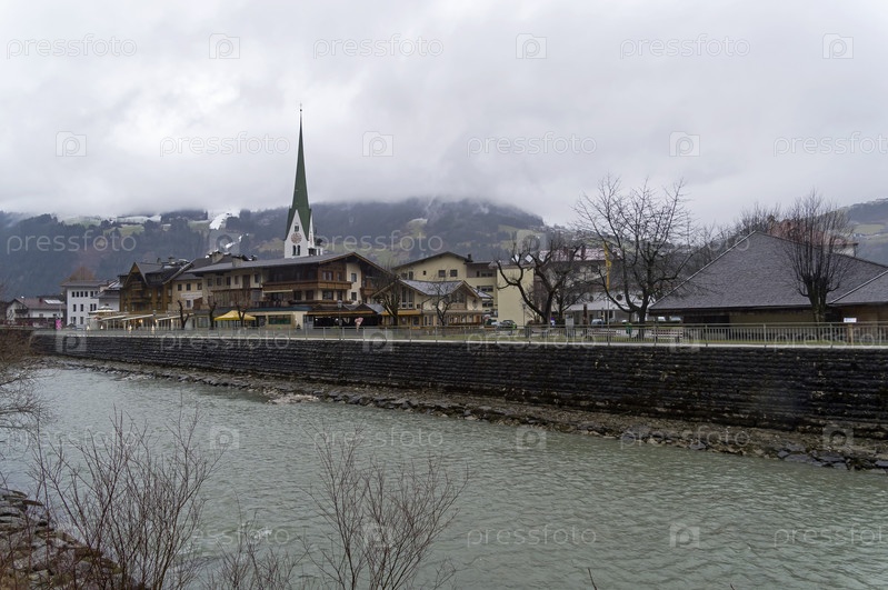 Вид на горнолыжный курорт Целль-ам-Циллер через реку Циллер. Тироль, Австрия. Весна, начало марта. Пасмурный день